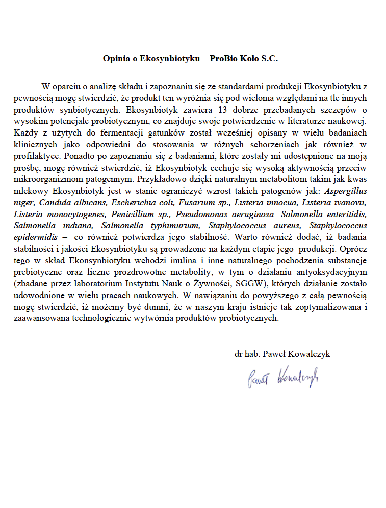 Ekosynbiotyk zawiera 13 dobrze przebadanych szczepów o wysokim potencjale probiotycznym, co znajduje swoje potwierdzenie w literaturze naukowej. Każdy z użytych do fermentacji gatunków został wcześniej opisany w wielu badaniach klinicznych jako odpowiedni do stosowania w różnych schorzeniach jak również w profilaktyce. Ponadto po zapoznaniu się z badaniami, które zostały mi udostępnione na moją prośbę, mogę również stwierdzić, iż Ekosynbiotyk cechuje się wysoką aktywnością przeciw mikroorganizmom patogennym. Przykładowo dzięki naturalnym metabolitom takim jak kwas mlekowy Ekosynbiotyk jest w stanie ograniczyć wzrost takich patogenów jak: Aspergillus niger, Candida albicans, Escherichia coli, Fusarium sp., Listeria innocua, Listeria ivanovii, Listeria monocytogenes, Penicillium sp., Pseudomonas aeruginosa Salmonella enteritidis, Salmonella indiana, Salmonella typhimurium, Staphylococcus aureus, Staphylococcus epidermidis – co również potwierdza jego stabilność.